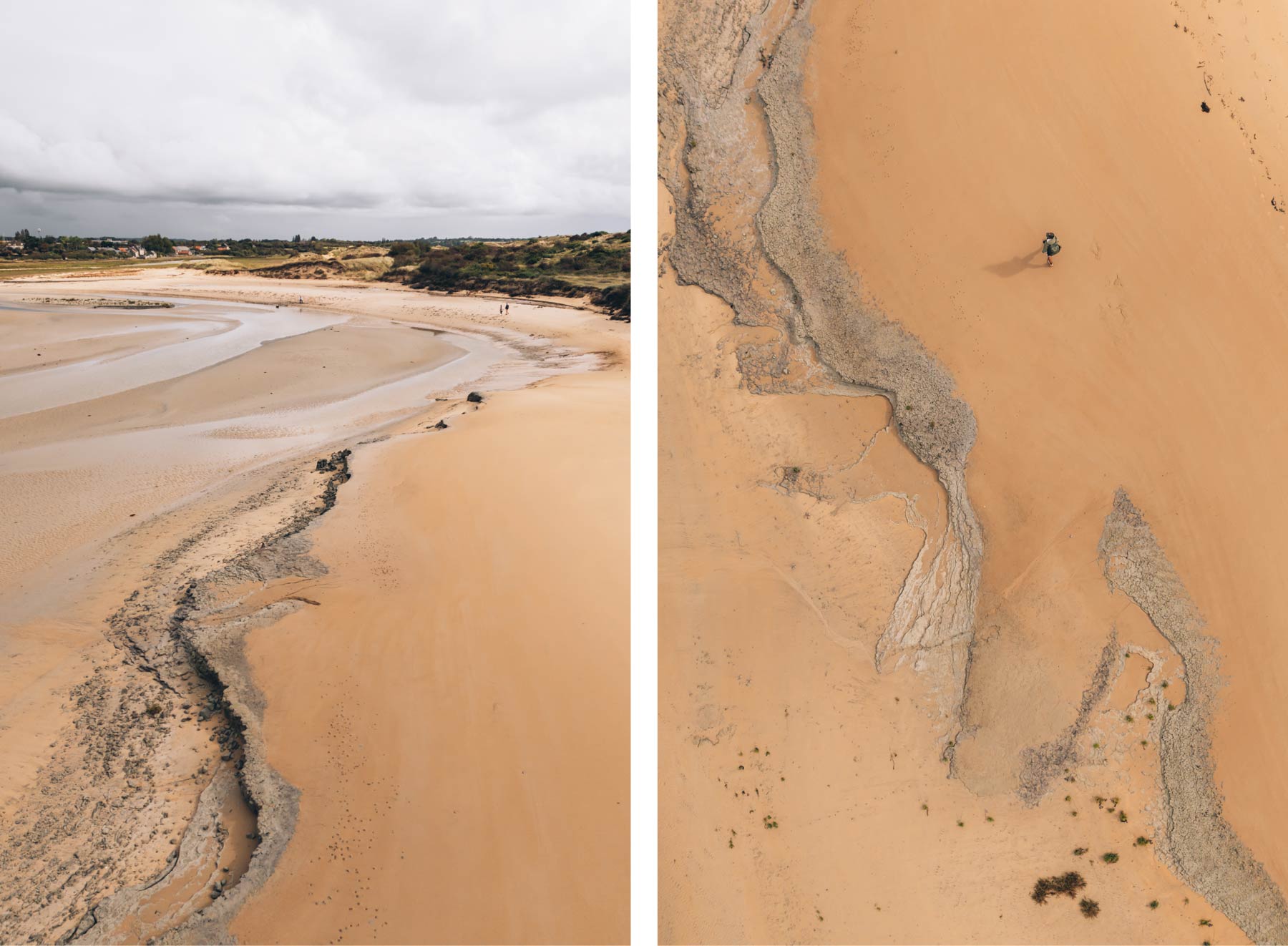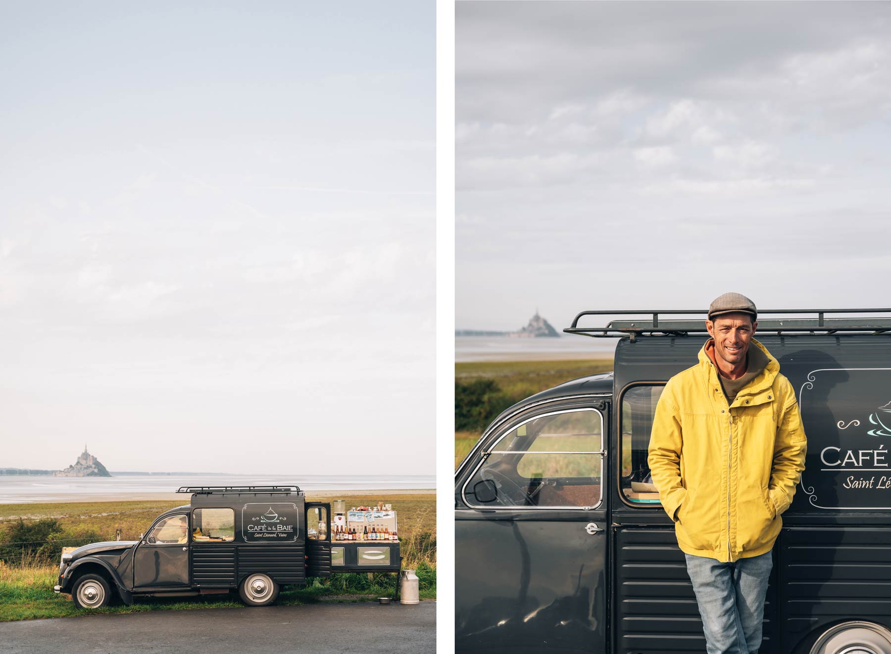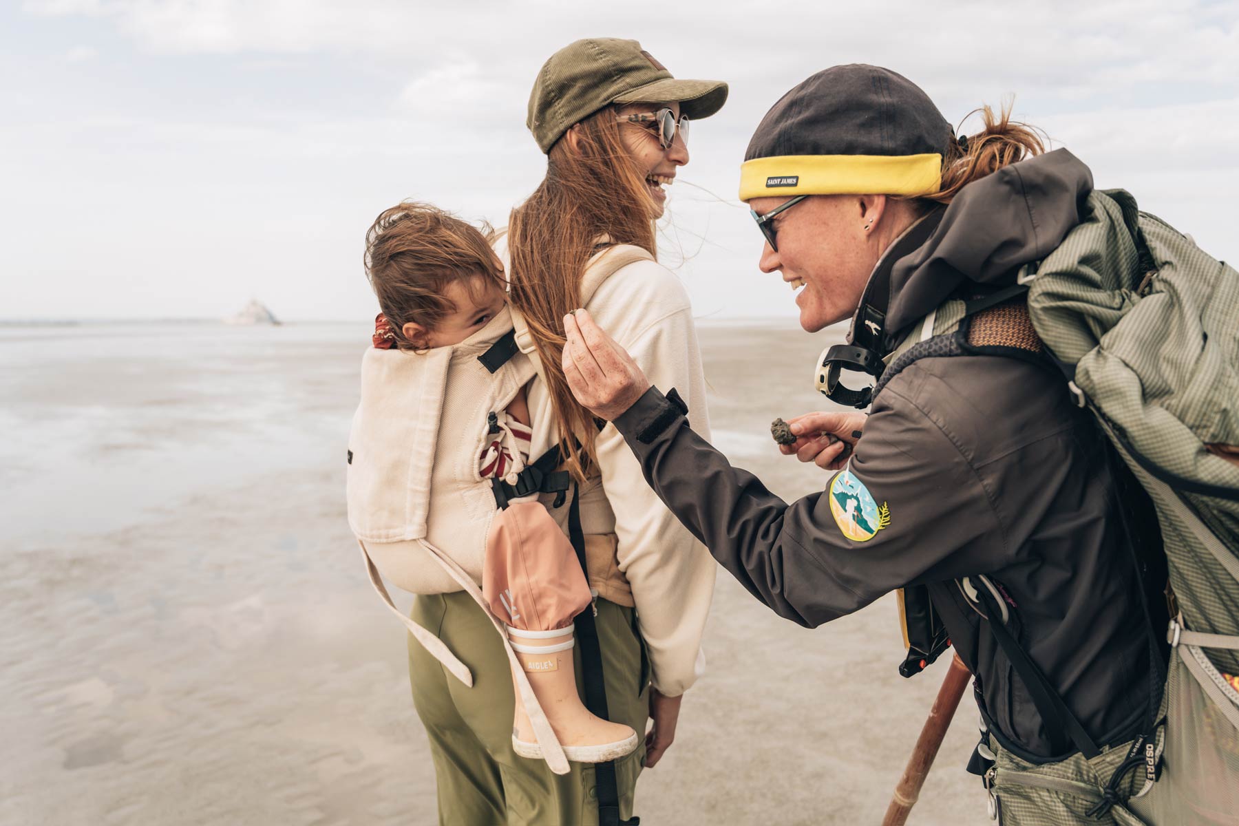 Après une bonne nuit dans la tiny, direction la Pointe du Grouin Sud pour rejoindre Séverine Loton, guide naturaliste attestée des traversées de la baie du Mont Saint Michel. Nous tombons tout d’abord sur Luke et son coffee truck ambulant. Australien d’origine, il est tombé lui aussi amoureux de la Manche et y vit depuis des années. Après un délicieux latte avec vue, nous saluons Séverine, parfaitement équipée pour cette nouvelle aventure. Même si nous avons déjà traversé la baie à plusieurs reprises ces dernières années, la magie opère toujours. Chaque sortie est unique, façonnée par les saisons, la lumière, les marées, la météo capricieuse et les oiseaux migrateurs… Un tableau vivant en perpétuel mouvement. Nous avançons, les yeux grands ouverts et les poumons emplis d’air iodé, émerveillés par ce lieu que nous aimons tant. Lily, installée confortablement en porte-bébé, s’offre une sieste au grand air, tandis que nous écoutons attentivement les récits de Séverine : migration des oiseaux, sables mouvants, géologie… la baie nous dévoile tous ses secrets. Après cette parenthèse hors du temps, il est l’heure de reprendre des forces au restaurant la Pause des Genêts, à seulement quelques minutes de notre point de départ.